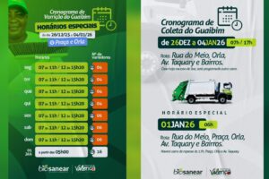 Prefeitura de Valença e Biosanear divulgam horários de coleta de lixo durante o recesso Jornal Valença Agora 23 de dezembro de 2025 Baixo Sul, Notícias A Prefeitura de Valença, em parceria com a Biosanear, informa à população os horários da coleta de lixo durante o período de recesso na praia de Guaibim. O serviço continuará sendo realizado conforme...