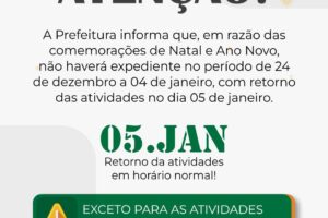 Prefeitura de Valença suspende expediente administrativo durante recesso de fim de ano Jornal Valença Agora 23 de dezembro de 2025 Baixo Sul, Notícias Atividades serão retomadas no dia 5 de janeiro; serviços essenciais seguem funcionando A Prefeitura de Valença informou que, em razão das comemorações de Natal e Ano Novo, não haverá expediente...