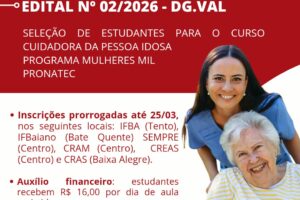 IFBA prorroga inscrições para curso de cuidadora de idosos em Valença Jornal Valença Agora 23 de março de 2026 Baixo Sul, Notícias O Instituto Federal da Bahia (IFBA), Campus Valença, prorrogou até a próxima quarta-feira (25) o prazo de inscrições para o curso de Cuidadora da Pessoa Idosa, ofertado pelo Programa Mulheres Mil, no...