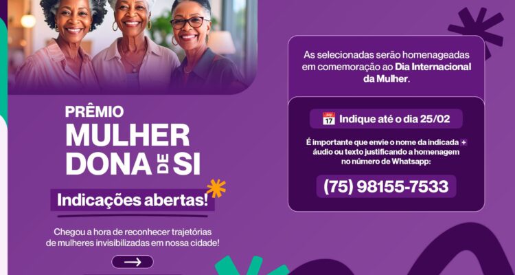As indicações podem ser enviadas até o dia 25 de fevereiro pelo WhatsApp (75) 8155-7533, com o nome da indicada acompanhado de um áudio ou texto que justifique a homenagem.
