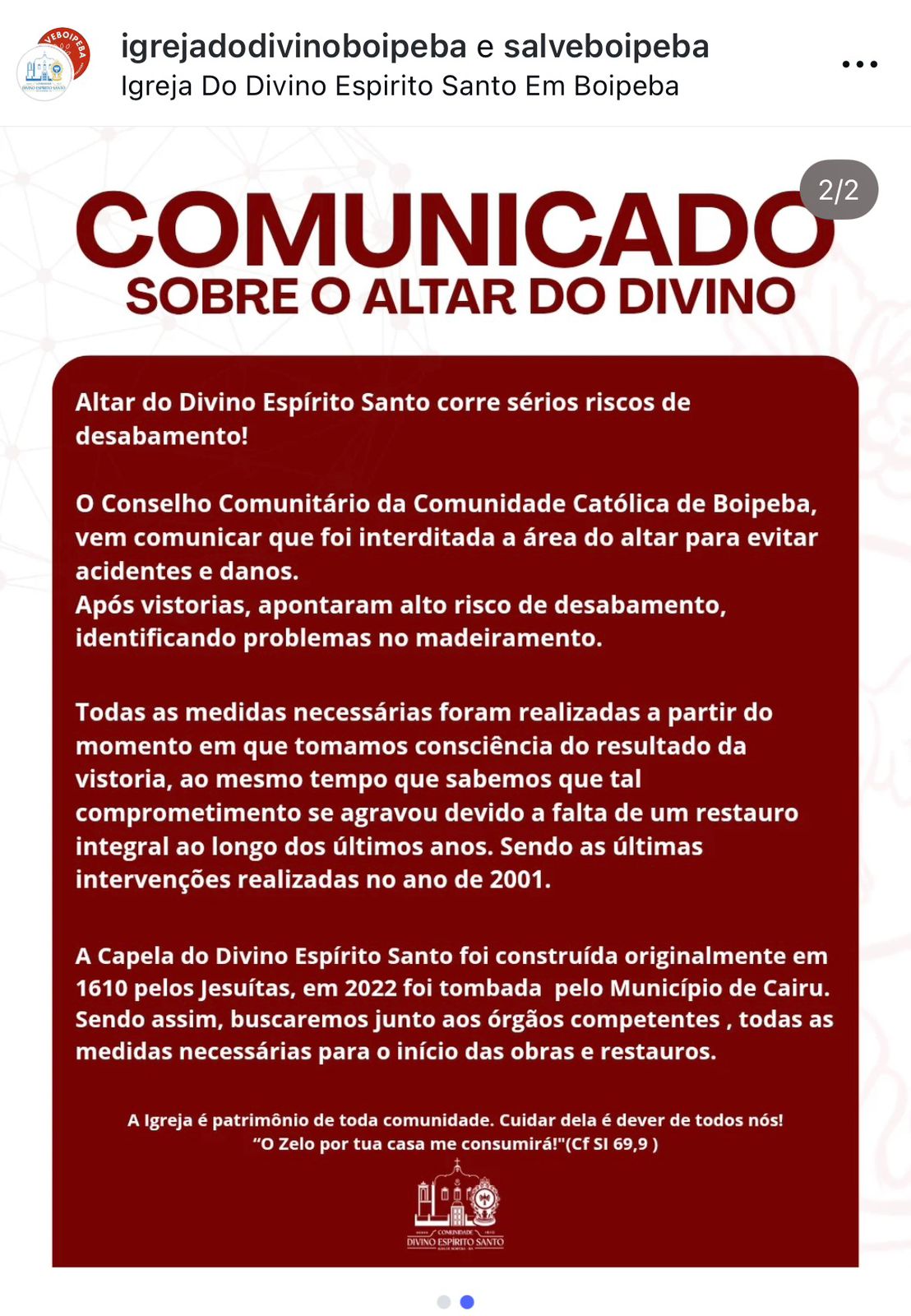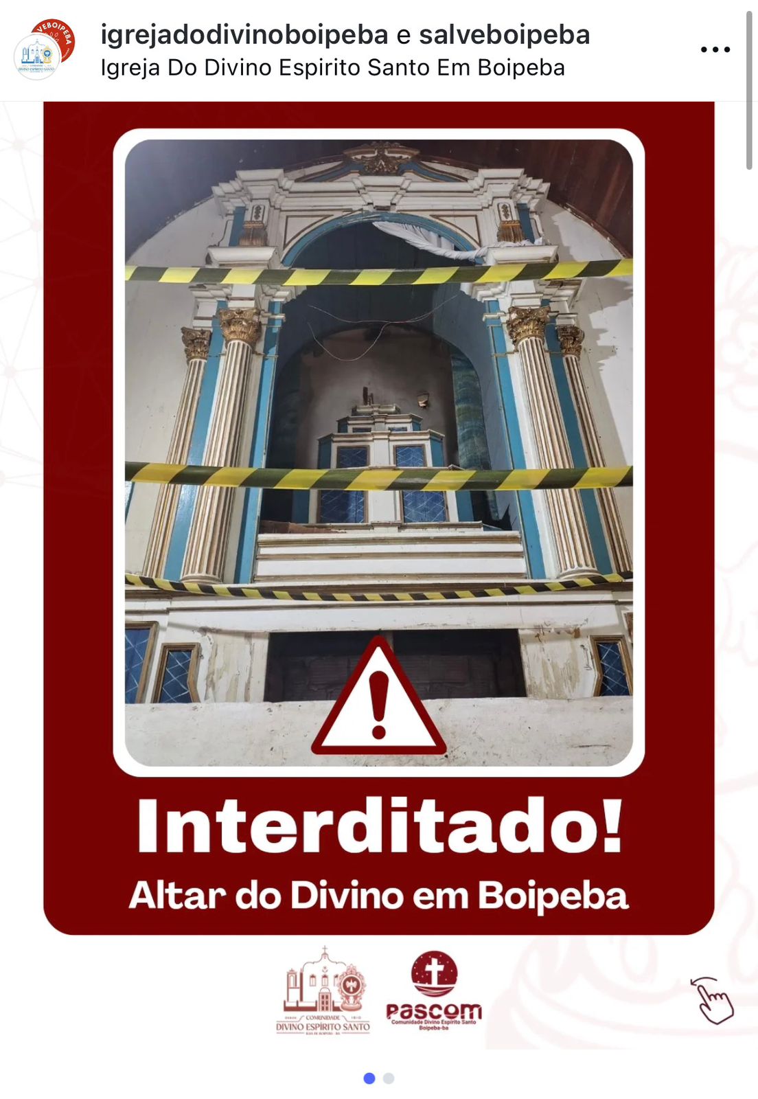 O Conselho Comunitário da Comunidade Católica de Boipeba informou a interdição da área do altar da histórica Capela do Divino Espírito Santo, localizada na ilha de Boipeba, no município de Cairu, após a identificação de alto risco de desabamento durante vistorias técnicas recentes.