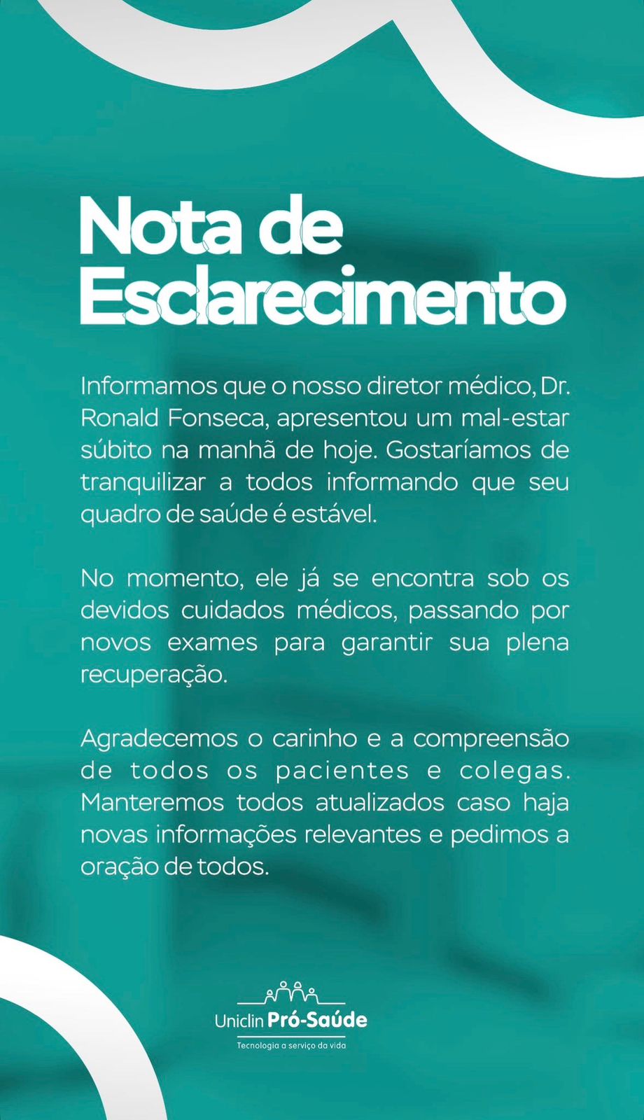 Após mal-estar, Dr. Ronald Fonseca passa bem e segue em observação no Hospital da Bahia Jornal Valença Agora 16 de dezembro de 2025 Baixo Sul, Notícias O médico Ronald Fonseca, diretor executivo da Uniclin Pró-Saúde, apresentou um mal-estar súbito na manhã desta terça-feira (16), durante atendimentos na unidade de saúde. De forma imediata, a equipe médica realizou exames ainda na própria clínica, que apontaram uma pequena área de isquemia cerebral, possivelmente relacionada a um quadro de hipertensão arterial. De acordo com informações repassadas pela família, o médico encontra-se estável, consciente e se comunicando normalmente. Por medida de cautela, ele foi encaminhado para Salvador, onde está internado no Hospital da Bahia, permanecendo em observação para acompanhamento clínico, suporte e vigilância, sem indicação, até o momento, de procedimentos ou intervenções mais invasivas. Em nota institucional, a Uniclin Pró-Saúde tranquilizou pacientes, colaboradores e parceiros, reforçando que o diretor médico está sob os devidos cuidados e passando por novos exames para assegurar sua plena recuperação. A empresa agradeceu as manifestações de carinho, solidariedade e compreensão, e informou que novas atualizações serão divulgadas caso haja informações relevantes. A família também agradeceu publicamente a preocupação demonstrada por amigos, pacientes e pela comunidade, destacando a importância do apoio recebido neste momento. LEIA NOTA: Deixe uma resposta Cancelar respostaSeu endereço de email não será publicado.ComentarNome* Email* Website Salvar meus dados neste navegador para a próxima vez que eu comentar.