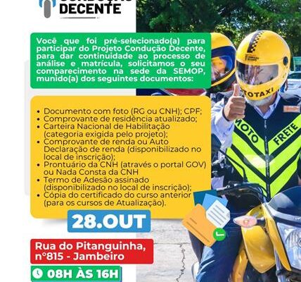 Candidatos pré-selecionados são convocados para o Projeto Condução Decente em Valença Jornal Valença Agora 21 de outubro de 2025 Baixo Sul, Notícias A Prefeitura de Valença, por meio da Secretaria de Mobilidade e Ordem Pública (SEMOP), informa que os candidatos pré-selecionados para o Projeto Condução Decente devem comparecer à unidade local para dar continuidade ao processo de análise e matrícula. O comparecimento deverá ocorrer no dia 28 de outubro de 2025, na Rua do Pitanguinha, bairro do Jambeiro, sede da Secretaria Municipal de Ordem Pública (SEMOP), no horário das 08h às 16h. Os participantes deverão levar documentos pessoais e comprobatórios, incluindo RG ou CNH, CPF, comprovante de residência atualizado, comprovante de renda (ou autodeclaração, disponível no local), prontuário ou nada consta da CNH, e, para os cursos de atualização, cópia do certificado anterior. O projeto Condução Decente é uma ação do Governo da Bahia por meio da Secretaria do Trabalho, Emprego, Renda e Esporte (SETRE), em parceria com a Fundação Luís Eduardo Magalhães (FLEM), Serviço Social do Transporte (SEST), Serviço Nacional de Aprendizagem do Transporte (SENAT), Departamento Estadual de Trânsito (Detran-Ba), Desenbahia e Fundo de Desenvolvimento Social e Econômico (FUNDESE) e tem como objetivo qualificar e valorizar profissionais do transporte, promovendo mais segurança e excelência no serviço prestado a população. Para mais informações, os candidatos podem entrar em contato pelo telefone (73) 2102-0288, pelo e-mail lucianodias@sestsenat.org.br ou na sede da SEMOP. Fonte: Secom Valença Deixe uma resposta Cancelar respostaSeu endereço de email não será publicado.ComentarNome* Email* Website Salvar meus dados neste navegador para a próxima vez que eu comentar.