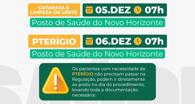 Etapas de catarata, limpeza de lente e pterígio têm novas datas na rede municipal de saúde Jornal Valença Agora 3 de dezembro de 2025 Baixo Sul, Notícias Secretaria de Saúde de Valença informa alteração no cronograma e orienta pacientes sobre documentação necessária A Prefeitura de Valença, por meio da Secretaria Municipal de Saúde, informa que houve mudança nas datas das etapas de catarata e limpeza de lente, além da etapa destinada ao tratamento de pterígio (retirada de carne do olho). O novo cronograma estabelece que os atendimentos de catarata e limpeza de lente serão realizados no dia 5 de dezembro, às 7h, no Posto de Saúde do Novo Horizonte. Já os procedimentos de pterígio acontecerão no dia 6 de dezembro, também às 7h, no mesmo local. Os pacientes que necessitam tratar pterígio não precisam passar previamente pela Regulação. Basta comparecer ao posto na data marcada, levando os documentos obrigatórios: RG, CPF, Cartão SUS e comprovante de residência. A Secretaria de Saúde reforça a importância de que todos os pacientes fiquem atentos ao novo cronograma e compareçam no horário informado, garantindo a organização do atendimento e o andamento adequado dos procedimentos. Deixe uma resposta Cancelar respostaSeu endereço de email não será publicado.ComentarNome* Email* Website Salvar meus dados neste navegador para a próxima vez que eu comentar.