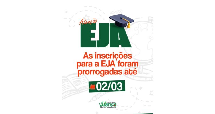 Inscrições para a EJA são prorrogadas até 02 de março em Valença Jornal Valença Agora 24 de fevereiro de 2026 Baixo Sul, Notícias A medida amplia a oportunidade para pessoas que não concluíram os estudos na idade regular e desejam retomar a vida escolar A Prefeitura de Valença, através da Secretaria de Educação, informa que foram prorrogadas até o dia 2 de março as inscrições para a Educação de Jovens e Adultos (EJA). A medida amplia a oportunidade para pessoas que não concluíram os estudos na idade regular e desejam retomar a vida escolar. As matrículas estão sendo realizadas no período noturno, das 19h às 21h, facilitando o acesso de estudantes que trabalham durante o dia. Os interessados devem procurar a escola mais próxima para obter informações e garantir a vaga. A EJA é uma importante política educacional que contribui para a inclusão social, a qualificação profissional e o exercício da cidadania. A orientação é que os candidatos não deixem para a última hora e realizem a matrícula dentro do prazo estabelecido. Fonte: Secom PMV Deixe uma resposta Cancelar respostaSeu endereço de email não será publicado.ComentarNome* Email* Website Salvar meus dados neste navegador para a próxima vez que eu comentar.