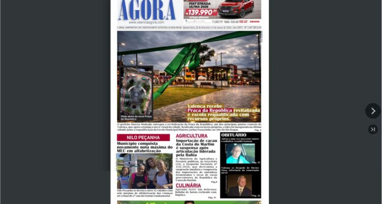 Jornal Valença Agora Edição nº. 1087 Valença Agora 26 de fevereiro de 2026 Baixo Sul, Edição da semana, Notícias Edição Online – Clique aqui para folhear o JVA, Edição 1.087 Para ler a edição em PDF, acesse: JVA Edição 1.087 Deixe uma resposta Cancelar respostaSeu endereço de email não será publicado.ComentarNome* Email* Website Salvar meus dados neste navegador para a próxima vez que eu comentar.