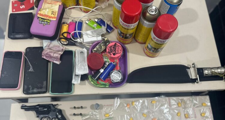 Ao abordarem os presentes, os militares encontraram 34 comprimidos de ecstasy, 24 porções de cocaína, 22 de maconha, 13 frascos de loló, além de um revólver e munições de calibre 32, encontrado no interior de um dos veículos fiscalizados. O condutor do automóvel recebeu voz de prisão.