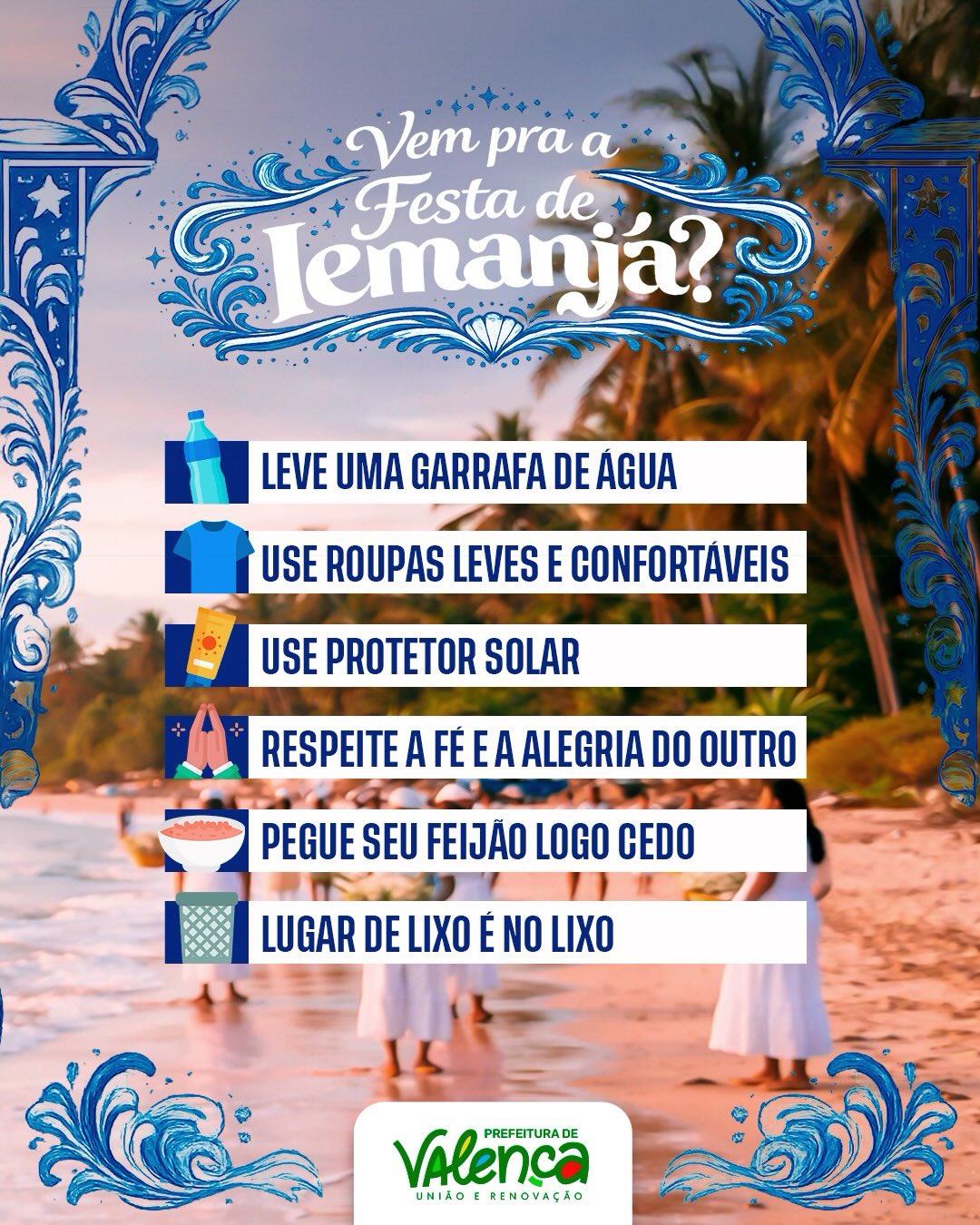 Promovido pela Prefeitura de Valença, através da Secretaria de Cultura, o evento convida moradores e visitantes a participarem de um momento marcado pelo respeito às tradições religiosas e à diversidade cultural. A programação tem início às 08h, com concentração em frente à ASPANG. Às 09h, ocorre a saída do cortejo com a entrega do presente a Iemanjá, um dos momentos mais simbólicos da celebração. Encerrando a manhã festiva, às 11h, o público poderá prestigiar o show da Banda Samba SD.