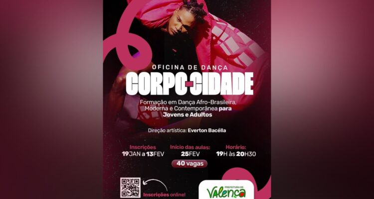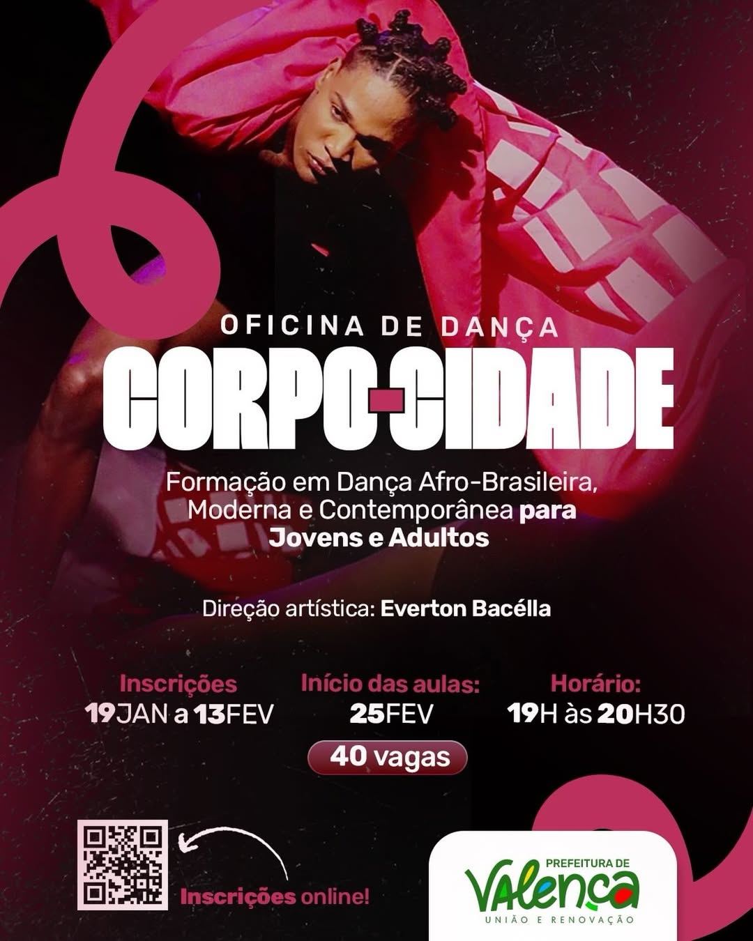 Prefeitura de Valença abre inscrições para a oficina de dança Corpo-Cidade Jornal Valença Agora 21 de janeiro de 2026 Arte, Cultura Iniciativa da Secretaria de Cultura propõe formação em dança afro-brasileira, moderna e contemporânea, voltada para jovens e adultos A Prefeitura de Valença, por meio da Secretaria Municipal de Cultura, está com inscrições abertas para a oficina de dança Corpo-Cidade, um projeto que propõe a relação entre corpo, movimento e espaço urbano, a partir de processos de experimentação, escuta e criação artística. A oficina oferece formação em dança afro-brasileira, moderna e contemporânea, sendo destinada a jovens e adultos interessados em vivências corporais e artísticas que dialogam com a cidade e suas múltiplas possibilidades de expressão. A direção artística é assinada por Everton Bacélla. As inscrições seguem abertas de 19 de janeiro a 13 de fevereiro e devem ser realizadas de forma online, por meio do QR Code disponível no material de divulgação. As aulas têm início previsto para o dia 25 de fevereiro, com encontros no horário das 19h às 20h30. Ao todo, estão sendo disponibilizadas 40 vagas. A oficina integra as ações da política cultural do município, voltadas ao incentivo à formação artística, à valorização da dança e ao fortalecimento da relação entre cultura, território e cidadania. Deixe uma resposta Cancelar respostaSeu endereço de email não será publicado.ComentarNome* Email* Website Salvar meus dados neste navegador para a próxima vez que eu comentar.