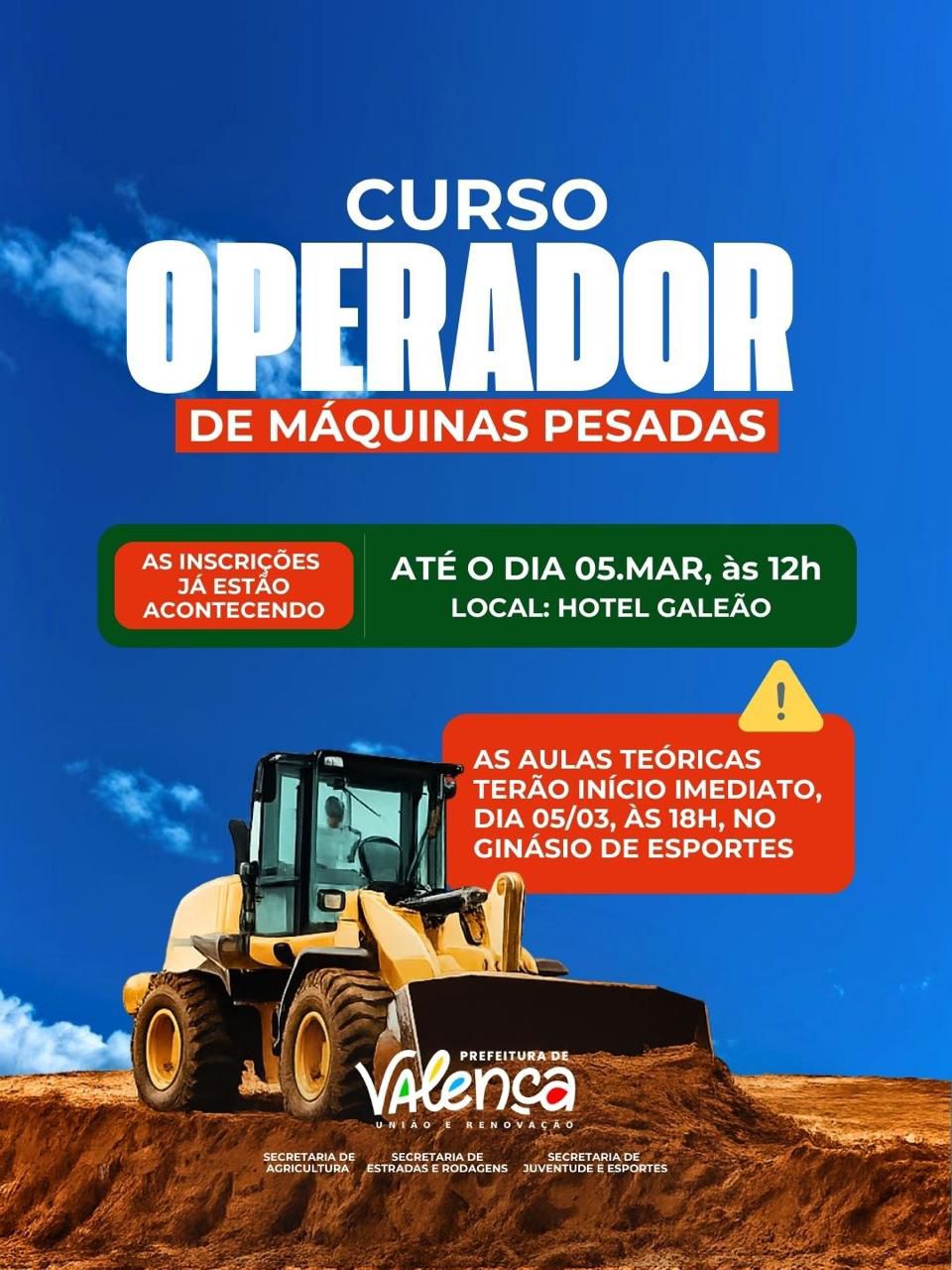 Prefeitura de Valença abre inscrições para o curso de Operador de Máquinas Pesadas Jornal Valença Agora 4 de março de 2026 Baixo Sul, Notícias O curso é oferecido pela GCS – Cursos Profissionalizantes, em parceria com as Secretarias Municipais de Agricultura, de Estradas e Rodagens, e Juventude e Esportes. As inscrições estão sendo realizadas no Hotel Galeão, localizado na rua Barão de Jiquiriçá, nº 191, Centro, e seguem até a próxima quinta-feira (05), às 12h. As aulas teóricas terão início imediato, no mesmo dia, às 18h, no Ginásio de Esportes de Valença. O curso tem como principal objetivo ampliar as chances de inserção no mercado de trabalho, especialmente em um segmento que apresenta alta demanda por mão de obra qualificada. A formação oferece conhecimentos técnicos fundamentais para a operação segura e eficiente de máquinas pesadas, contribuindo diretamente para o desenvolvimento dos setores agrícola, de infraestrutura e de obras públicas no município. O secretário de Agricultura, Clóvis Coutinho, destacou a importância da iniciativa e relembrou o sucesso da edição anterior. “No ano passado tivemos mais de 500 inscritos, o que demonstra o interesse da nossa população por qualificação profissional. Esse curso abre portas, gera renda e fortalece o mercado de trabalho em Valença. Convidamos todos que desejam se capacitar a não perderem essa oportunidade”, afirmou. Fonte: Secretaria de Comunicação | SECOM Prefeitura Municipal de Valença Deixe uma resposta Cancelar respostaSeu endereço de email não será publicado.ComentarNome* Email* Website Salvar meus dados neste navegador para a próxima vez que eu comentar.