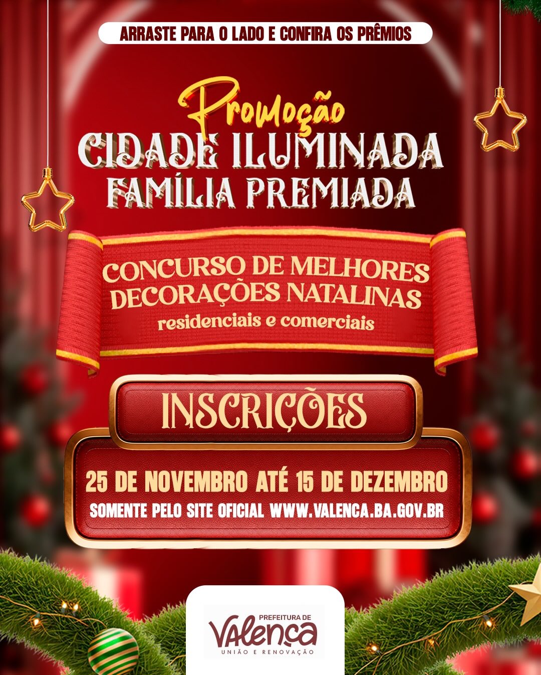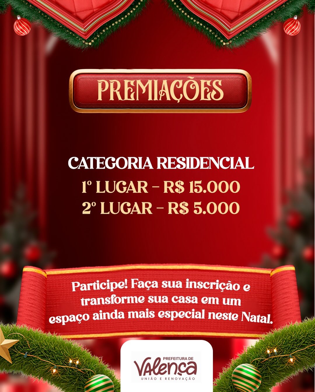 Prefeitura de Valença divulga mudanças na categoria comercial do concurso “Cidade Iluminada, Família Premiada” para fortalecer participação empresarial Jornal Valença Agora 9 de dezembro de 2025 Baixo Sul, Notícias A Prefeitura Municipal de Valença alterou o Edital do Processo Administrativo nº 362/2025, referente ao Concurso nº 001/2025, “Cidade Iluminada, Família Premiada”, que premia as melhores decorações natalinas do município. A mudança consiste na remoção da categoria “Comercial”, que agora será organizada exclusivamente pela Câmara de Dirigentes Lojistas (CDL), que divulgará as informações oficiais a partir da próxima semana. De acordo com a administração municipal, a decisão busca ampliar a participação do setor empresarial, fortalecer o comércio local e evitar a realização de campanhas paralelas ao concurso oficial. A parceria com a CDL pretende garantir maior adesão dos comerciantes, além de contribuir para uma organização do processo avaliativo e para o alinhamento das ações promovidas no período natalino. A categoria Residencial, por sua vez, permanece inalterada, mantendo os mesmos prazos, premiação e critérios previstos no edital. As inscrições seguem abertas até 15 de dezembro, por meio da ficha de inscrição disponível no site oficial da prefeitura: www.valenca.ba.gov.br O cronograma geral do concurso também está mantido. O período de julgamento ocorrerá entre 16 e 23 de dezembro de 2025, com divulgação dos resultados em 30 de dezembro. A cerimônia de premiação está prevista para 14 de janeiro de 2026. O Edital está disponível no site do Diário Oficial da Prefeitura Municipal de Valença/Bahia: https://diario.valenca.ba.gov.br/homepage. Com a alteração, o prefeito Marcos Medrado destaca o incentivo à participação dos empresários locais na decoração da cidade durante o Natal, tornando o concurso mais colaborativo e fortalecendo o clima festivo no comércio valenciano. Fonte: Secretaria de Comunicação |SECOM Prefeitura Municipal de Valença Deixe uma resposta Cancelar respostaSeu endereço de email não será publicado.ComentarNome* Email* Website Salvar meus dados neste navegador para a próxima vez que eu comentar.