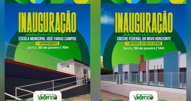 Prefeitura de Valença inaugura escola municipal e creche federal nesta sexta-feira (30) Jornal Valença Agora 29 de janeiro de 2026 Baixo Sul, Notícias Unidades educacionais no Entroncamento e no bairro Novo Horizonte reforçam investimentos na educação e no cuidado com crianças e estudantes A Prefeitura Municipal de Valença realiza, nesta sexta-feira (30), duas importantes inaugurações na área da educação, ampliando a oferta de ensino e fortalecendo a política pública voltada ao desenvolvimento social do município. Pela manhã, às 10h, será inaugurada a Escola Municipal José Farias Campos, localizada no bairro Entroncamento. A unidade passou por reestruturação completa e está pronta para atender estudantes em um ambiente organizado, moderno e adequado ao processo de ensino-aprendizagem, reafirmando o compromisso com a formação das novas gerações. Já no período da tarde, às 14h, será a vez da inauguração da Creche Federal do Novo Horizonte, situada no bairro Novo Horizonte, em frente ao Tiro de Guerra. O novo equipamento educacional é resultado da parceria entre o Governo Federal e o município e amplia o acesso à educação infantil, oferecendo um espaço moderno, seguro e preparado para o cuidado e o desenvolvimento das crianças. Deixe uma resposta Cancelar respostaSeu endereço de email não será publicado.ComentarNome* Email* Website Salvar meus dados neste navegador para a próxima vez que eu comentar.