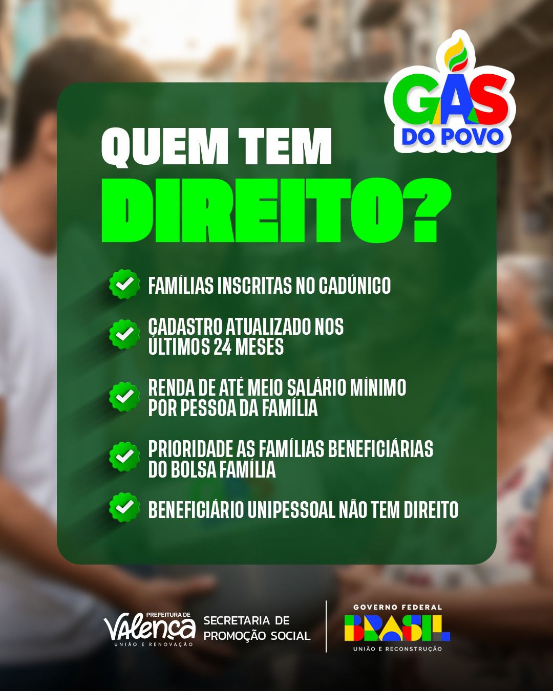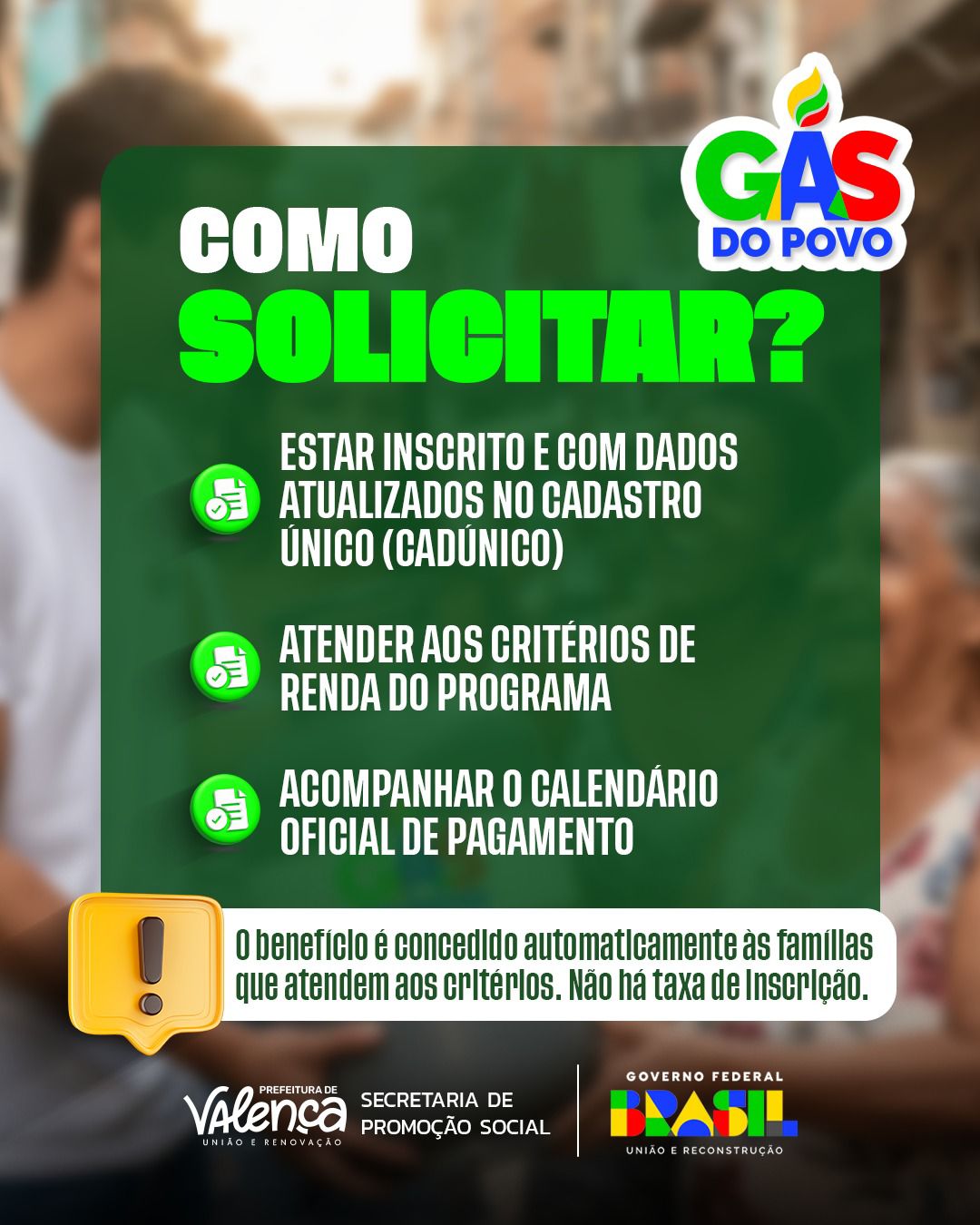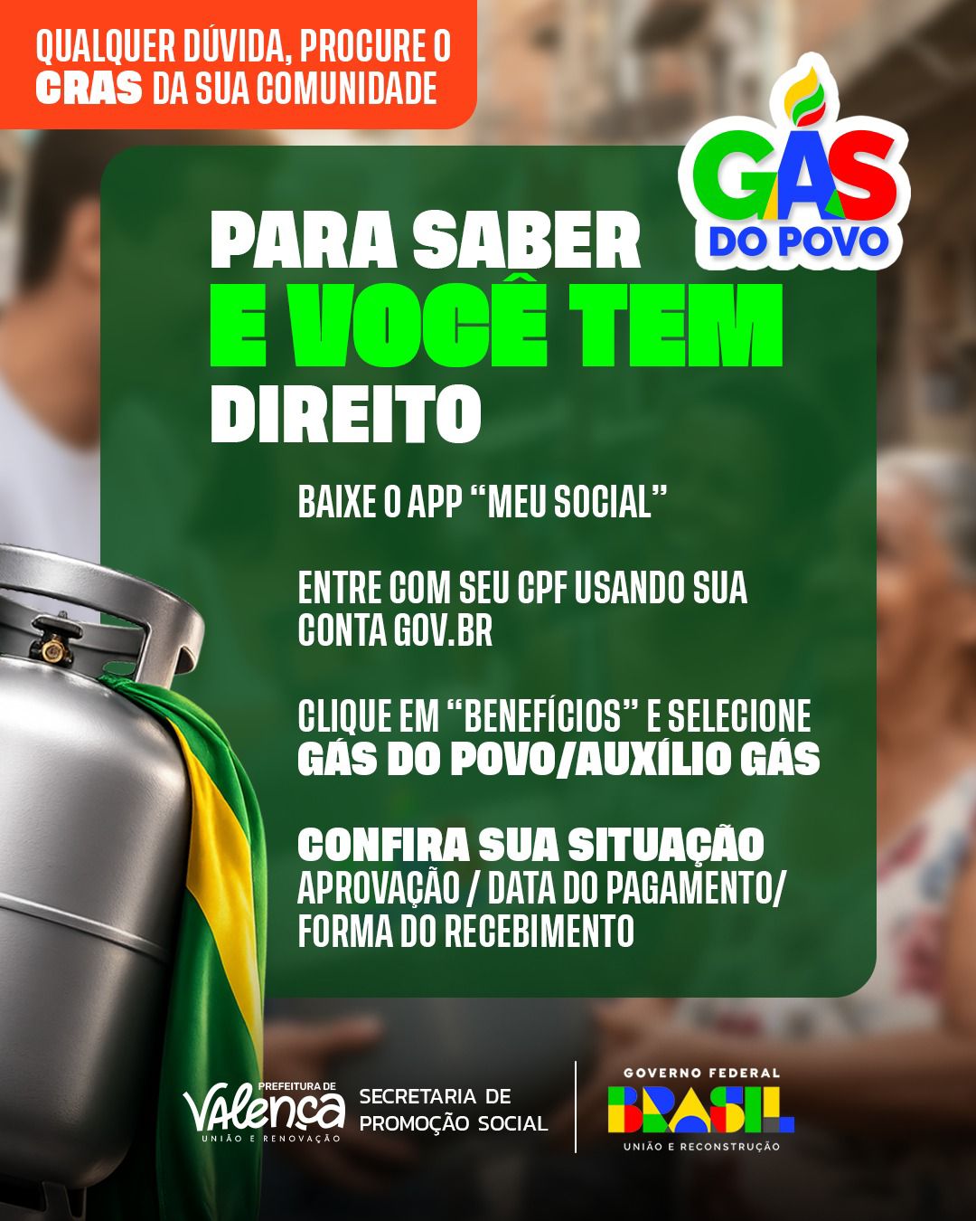 Programa Gás do Povo já é realidade e leva mais dignidade às famílias Jornal Valença Agora 5 de março de 2026 Baixo Sul, Notícias O Programa Gás do Povo agora está funcionando em um novo formato e passa a garantir a recarga gratuita do botijão de gás para famílias que realmente precisam. O benefício é disponibilizado diretamente nas revendas credenciadas. Para ter direito, é fundamental que o cadastro no CadÚnico esteja atualizado. A seleção das famílias é realizada pelo Governo Federal. A Prefeitura de Valença está pronta para orientar a população. Quem precisar atualizar os dados ou tirar dúvidas pode procurar a equipe da Secretaria de Promoção Social. Fonte: Secretaria de Comunicação | SECOM Prefeitura Municipal de Valença Deixe uma resposta Cancelar respostaSeu endereço de email não será publicado.ComentarNome* Email* Website Salvar meus dados neste navegador para a próxima vez que eu comentar.