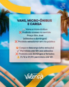 Já para vans, micro-ônibus e veículos de carga, fica proibido o acesso no sentido da Praça São José aos sábados e domingos, bem como o estacionamento em via pública. A carga e descarga, durante a alta estação, será permitida até as 10h aos sábados, sendo proibida aos domingos e feriados. Excepcionalmente nos dias 31 de dezembro e 1º de janeiro, a atividade será autorizada até as 12h.