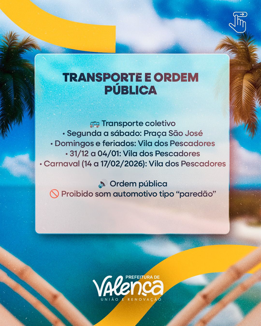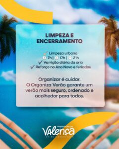 Segundo a Prefeitura, o Programa Organiza Verão reforça o compromisso da gestão com o planejamento, a responsabilidade e o cuidado com os espaços públicos, buscando equilibrar lazer, mobilidade, atividade econômica e qualidade de vida durante o verão em Valença.