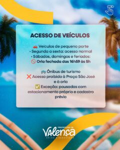 O acesso de veículos à orla também passa por regras específicas. Veículos de pequeno porte terão acesso normal de segunda a sexta-feira, enquanto aos sábados, domingos e feriados a orla será fechada das 16h59 às 5h. Ônibus de turismo estão proibidos de acessar tanto a Praça São José quanto a orla, com exceção apenas para pousadas que possuam estacionamento próprio e cadastro prévio junto ao município.