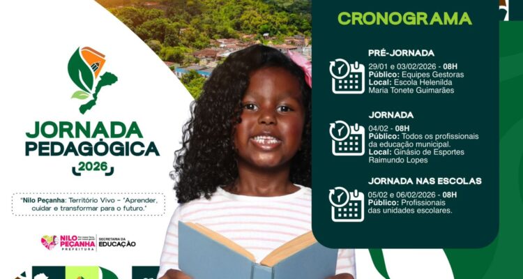 Secretaria de Educação de Nilo Peçanha divulga cronograma da Jornada Pedagógica 2026 Jornal Valença Agora 29 de janeiro de 2026 Baixo Sul, Notícias A Secretaria Municipal da Educação de Nilo Peçanha divulgou oficialmente o cronograma da Jornada Pedagógica 2026, que terá início nesta quarta-feira, 29 de janeiro, com a realização da Pré-Jornada, reunindo as equipes gestoras da rede municipal. Com o tema “Nilo Peçanha: Território Vivo — Aprender, Cuidar e Transformar para o Futuro”, a Jornada Pedagógica será um importante momento de formação, planejamento e alinhamento das ações educacionais para o ano letivo, fortalecendo o compromisso do município com uma educação pública de qualidade, humana e sustentável. Programação A Jornada será realizada em três etapas: Pré-Jornada 🗓 29 de janeiro e 03 de fevereiro de 2026 ⏰ 08h 👥 Público: Equipes gestoras (diretores, vice-diretores e coordenadores pedagógicos). 📍 Local: Escola Helenilda Maria Tonete Guimarães. Jornada Pedagógica 🗓 04 de fevereiro ⏰ 08h 👥 Público: Todos os profissionais da educação municipal. 📍 Local: Ginásio de Esportes Raimundo Lopes. Jornada nas Escolas 🗓 05 e 06 de fevereiro de 2026 ⏰ 08h 👥 Público: Profissionais das unidades escolares. 📍 Locais: Nas próprias escolas da rede municipal. Construção coletiva e fortalecimento da rede O secretário municipal da Educação, José Augusto, destaca que a Jornada Pedagógica é um espaço essencial de escuta, diálogo e troca de experiências entre os profissionais da rede. “Esse é um momento fundamental para alinharmos metas, refletirmos sobre nossas práticas e planejarmos, de forma coletiva, um ano letivo de avanços. Estamos preparando o caminho para uma educação cada vez mais inclusiva, inovadora e conectada com a realidade do nosso território”, ressaltou. A proposta pedagógica de 2026 reforça a valorização do território, do meio ambiente e das relações humanas, reconhecendo a escola como espaço de transformação social. Com a Jornada Pedagógica, a Prefeitura de Nilo Peçanha reafirma seu compromisso com a formação contínua dos educadores e com a construção de uma educação que transforma vidas e fortalece o futuro do município. Fonte: Ascom PMNPeçanha Deixe uma resposta Cancelar respostaSeu endereço de email não será publicado.ComentarNome* Email* Website Salvar meus dados neste navegador para a próxima vez que eu comentar.