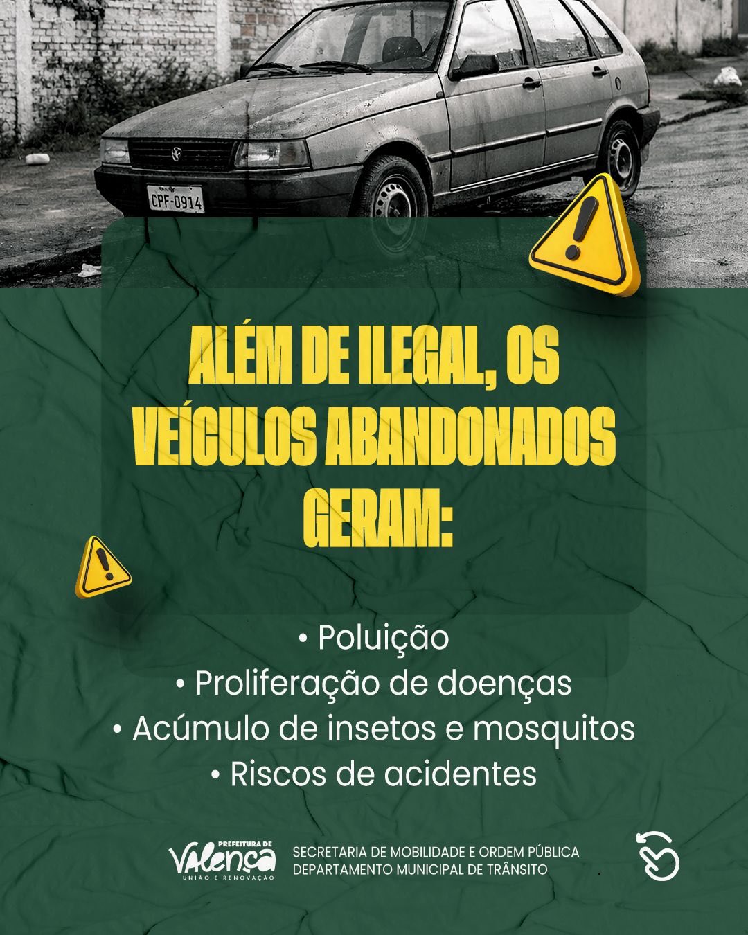 Manter a cidade organizada, segura e com vias livres para circulação é uma responsabilidade compartilhada entre o poder público e a população. Pensando nisso, a Prefeitura de Valença, por meio da Secretaria de Mobilidade e Ordem Pública, com o apoio do Departamento Municipal de Trânsito, vai iniciar uma grande operação de ordenamento das vias urbanas para identificar, notificar e remover veículos abandonados em espaços públicos.