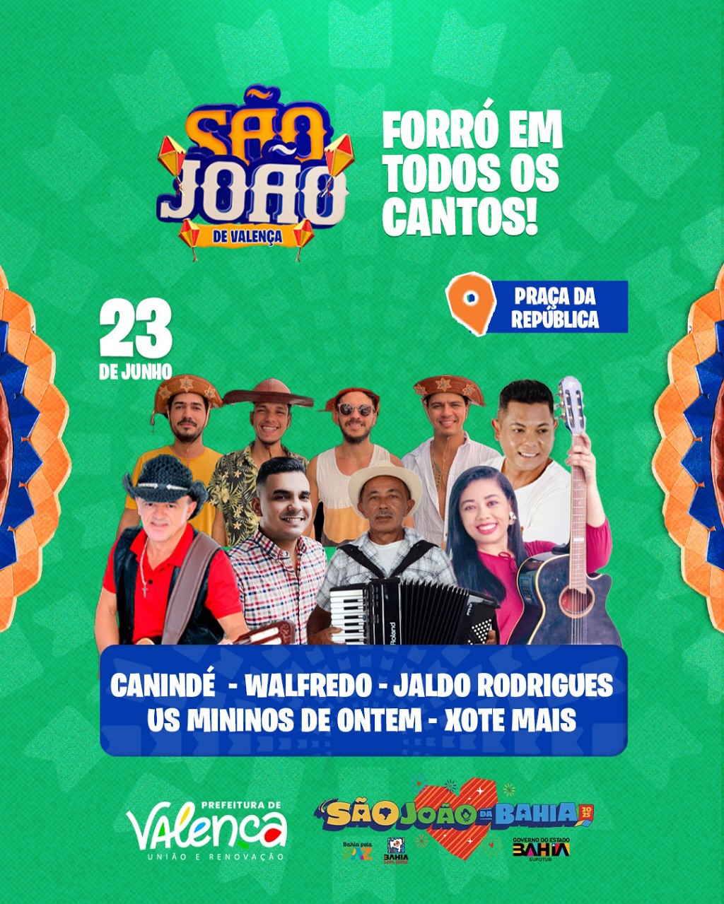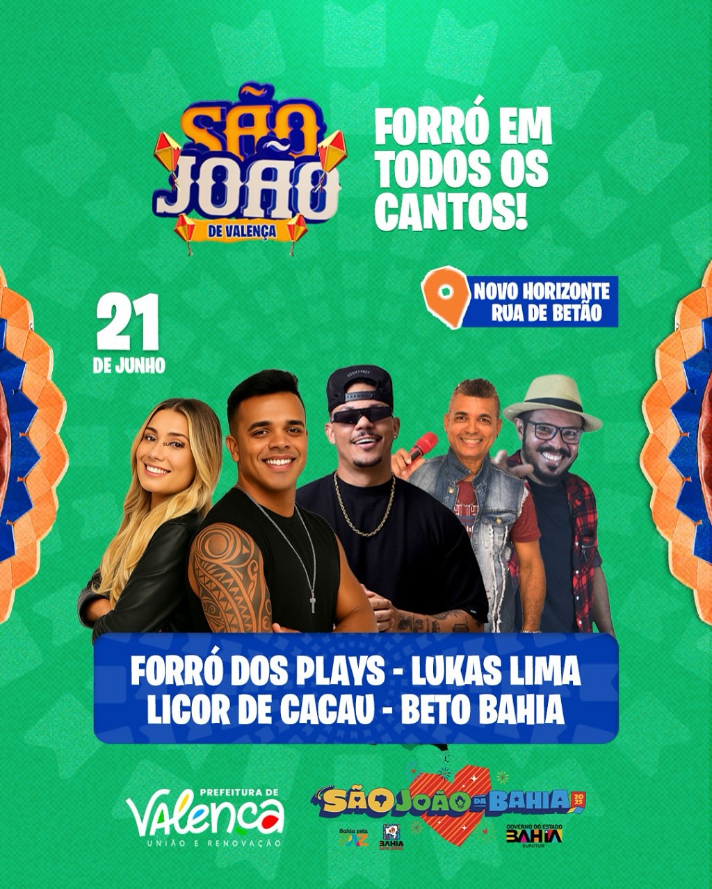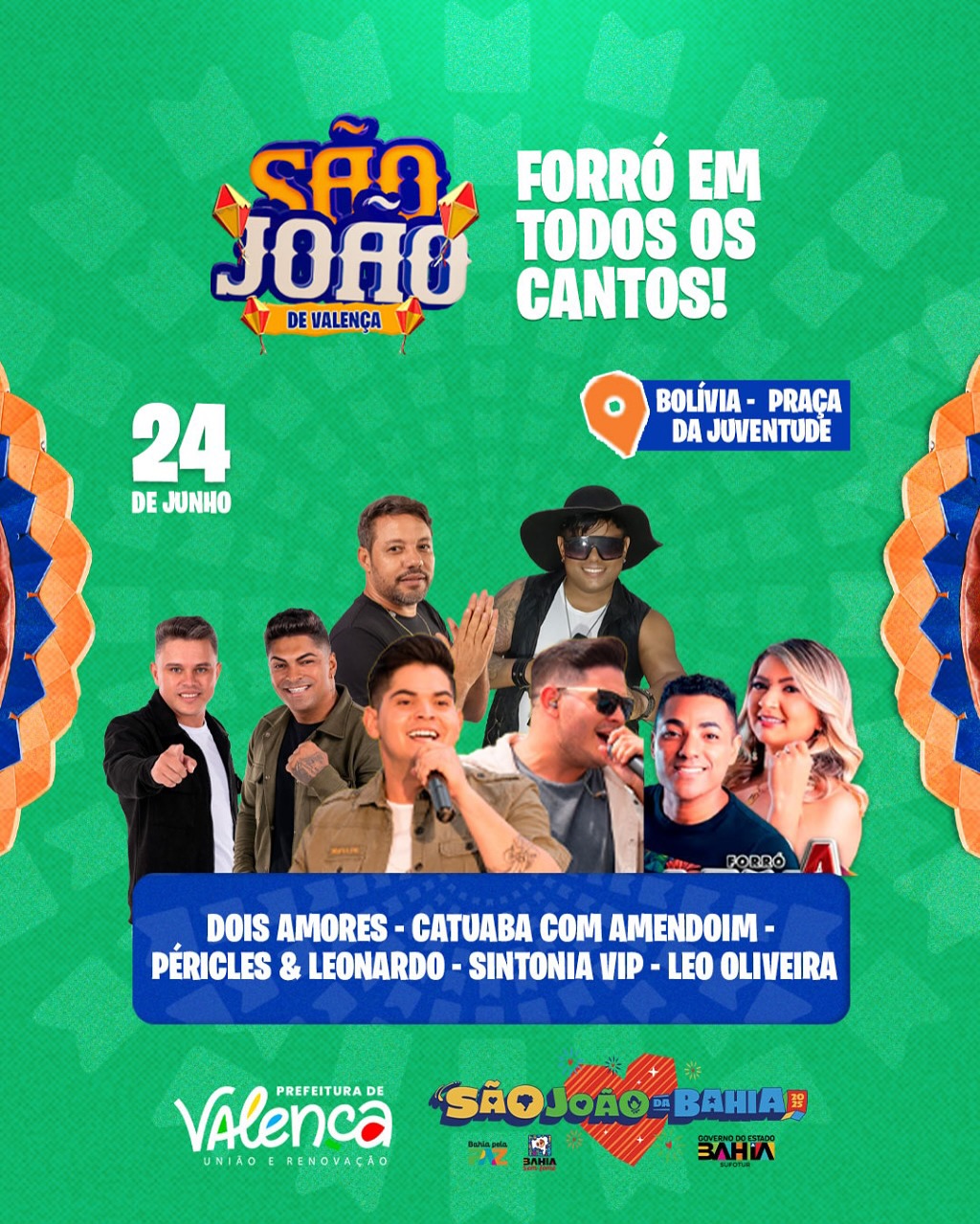 Entre as atrações estão artistas de reconhecimento nacional como Solange Almeida, Raí Saia Rodada, Leo Santana, Estakazero, Leonardo, Papazoni, Berguinho, Adelmario Coelho, Bell Marques, Limão com Mel, Gustavo Mioto e Belo. Além disso, Valença sediará um grande Festival de Quadrilhas Juninas no dia 29, reunindo mais de 10 grupos de outras cidades.
