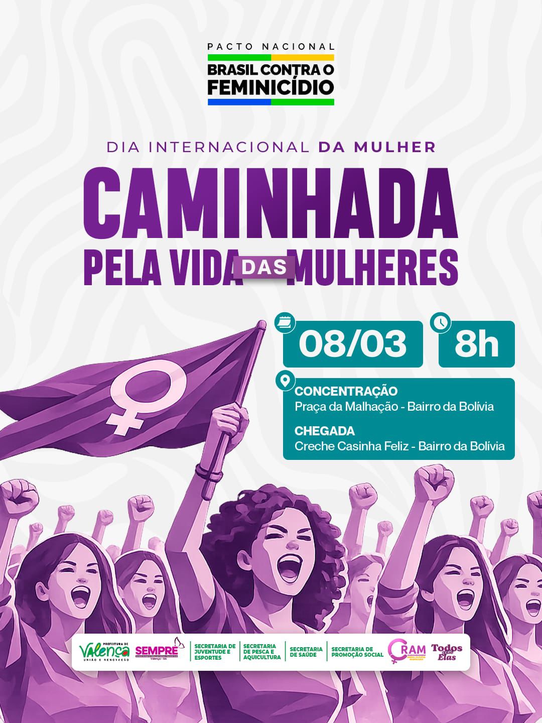 O Dia Internacional das Mulheres, celebrado neste domingo, 8 de março, será marcado em Valença pela Caminhada pela Vida das Mulheres, com concentração às 8h, na Praça da Malhação, no bairro da Bolívia.
