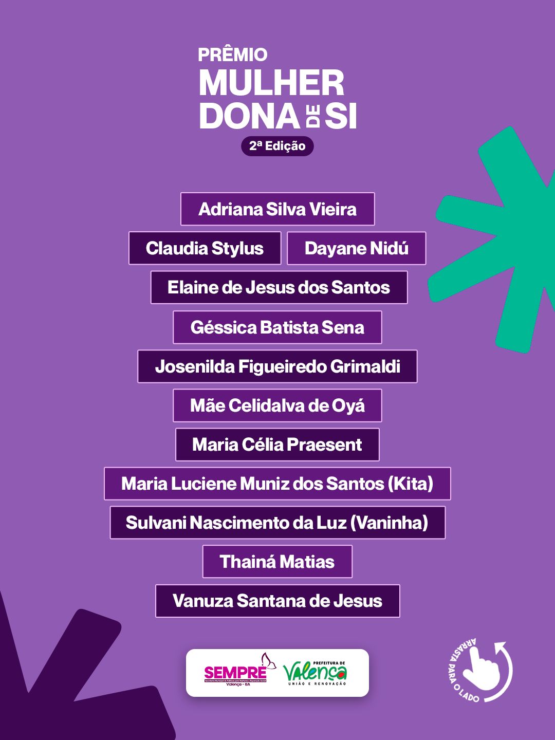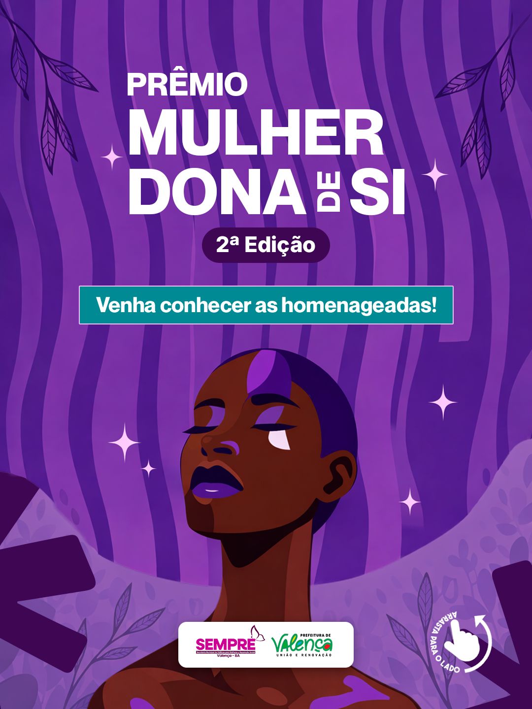 Valença realiza Prêmio Mulher Dona de Si 2026 nesta sexta-feira (13) Jornal Valença Agora 12 de março de 2026 Baixo Sul, Notícias Através da Secretaria de Políticas para Mulheres e Reparação, a Prefeitura de Valença realiza, no dia 13 de março, ás 19h, no Centro de Cultura de Valença, a cerimônia do Prêmio Mulher Dona de Si, uma homenagem especial a mulheres que se destacam por sua força, trajetória e contribuição para a sociedade valenciana. Nesta edição, 12 mulheres foram selecionadas para receber a premiação, representando diferentes histórias de coragem, liderança e transformação em nossa comunidade. O evento também prestará uma homenagem in memoriam a Cecília Crispim (1981–2017), vítima de feminicídio, reforçando a importância da luta pelo respeito, pela vida e pelos direitos das mulheres. 💜 A premiação celebra trajetórias inspiradoras e reforça o protagonismo feminino em Valença. Fonte: Secretaria de Comunicação |SECOM Prefeitura Municipal de Valença Deixe uma resposta Cancelar respostaSeu endereço de email não será publicado.ComentarNome* Email* Website Salvar meus dados neste navegador para a próxima vez que eu comentar.