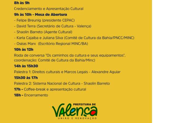 A Companhia de Artistas Independentes (CEPAC), com apoio da Prefeitura de Valença, através de sua Secretaria Municipal de Cultura, está promovendo o Encontro Territorial de Formação em Políticas Públicas da Cultura, no próximo dia 15 de Outubro no Theatro Municipal.