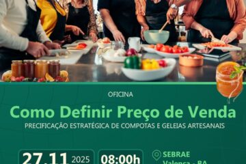 O Sebrae em Valença, situado na avenida Tancredo Neves, 212, Graça, sediará na próxima terça-feira (17), das 18 às 22h, a oficina “Precificação inteligente”. A capacitação é gratuita e tem inscrições abertas no site do Sebrae, clique aqui.